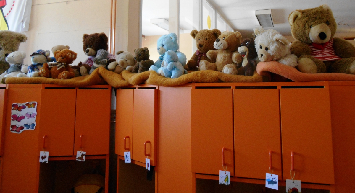 Vzgojiteljice so nam zaigrale krasno igro - o Zlatolaski in treh medvedih (na drugi fotki so stoli in skledice treh medvedov) in vanjo vključile marsikaj, kar je primerno za čisto majhne otroke ... da ne sme Zlatolaska hoditi sama po gozdu, ker je še premajhna, da je včasih plenička nepotrebna in je potuha in še kaj. Potem smo v spremstvu treh medvedov, očeta z 61 let starim medvedkom, mame s 50 let starim medvedkom, in otroka medvedka, ter Zlatolaske odšli na hrib v gozd ... v Jurčkov gozd.