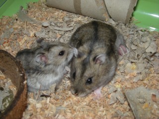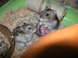 Ponoči pridem preverit, če je vse v redu ... pomencam si oči, pa še enkrat, oba hrčka sta skupaj. Še enkrat pogledam, vidim oba hrčka skupaj na tisti strani, kjer so mladički. Hm ...