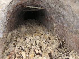 Dobrih sedem metrov globoko smo zagledali prvo človeško lobanjo. ... Kak meter nižje smo naleteli na množico človeških okostij, ki so bila prepletena kot padle veje s spodrezanega drevja. ... le nekaj lobanj, ki so bile poškodovane s strelnim orožjem. Druge žrtve so v črni, peklenski in kamniti utrdbi umrle zaradi padca. In umirale dolgo. ... Našel sem še en šop dolgih las in žensko sandalo. In še eno. ...
