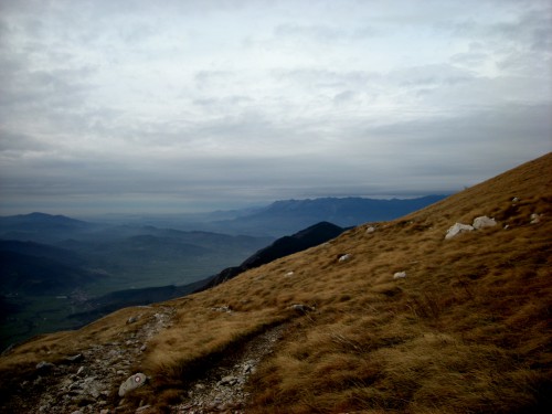 Potem pa navzdol. Z "ranjenima" čevljema na nogah se mi zdi varneje in enostavneje iti po manj strmi poti,