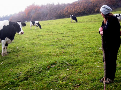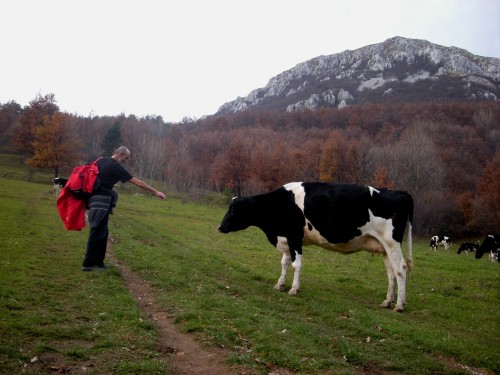 Ko greva spet skozi pašnik, se s kravami pogovarjava ...
