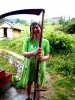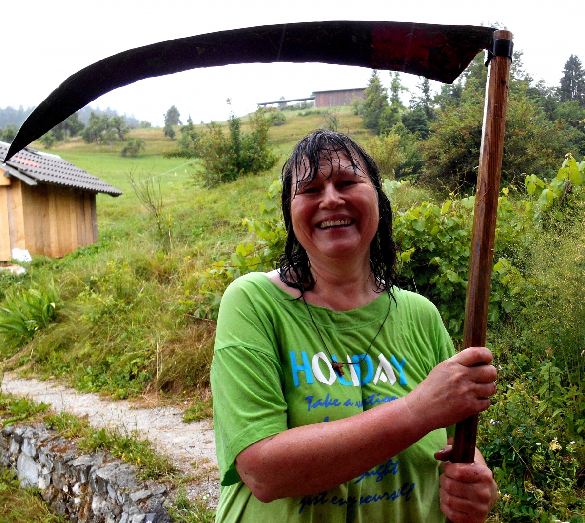 Vlije se dež in potem gre lažje. Bliska se in grmi, vendar ne toliko, da bi nas pregnalo, dokler ne pokosimo celega brega! Smo res premočeni, a dobre volje!