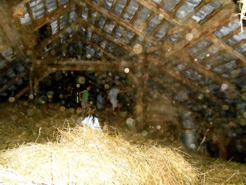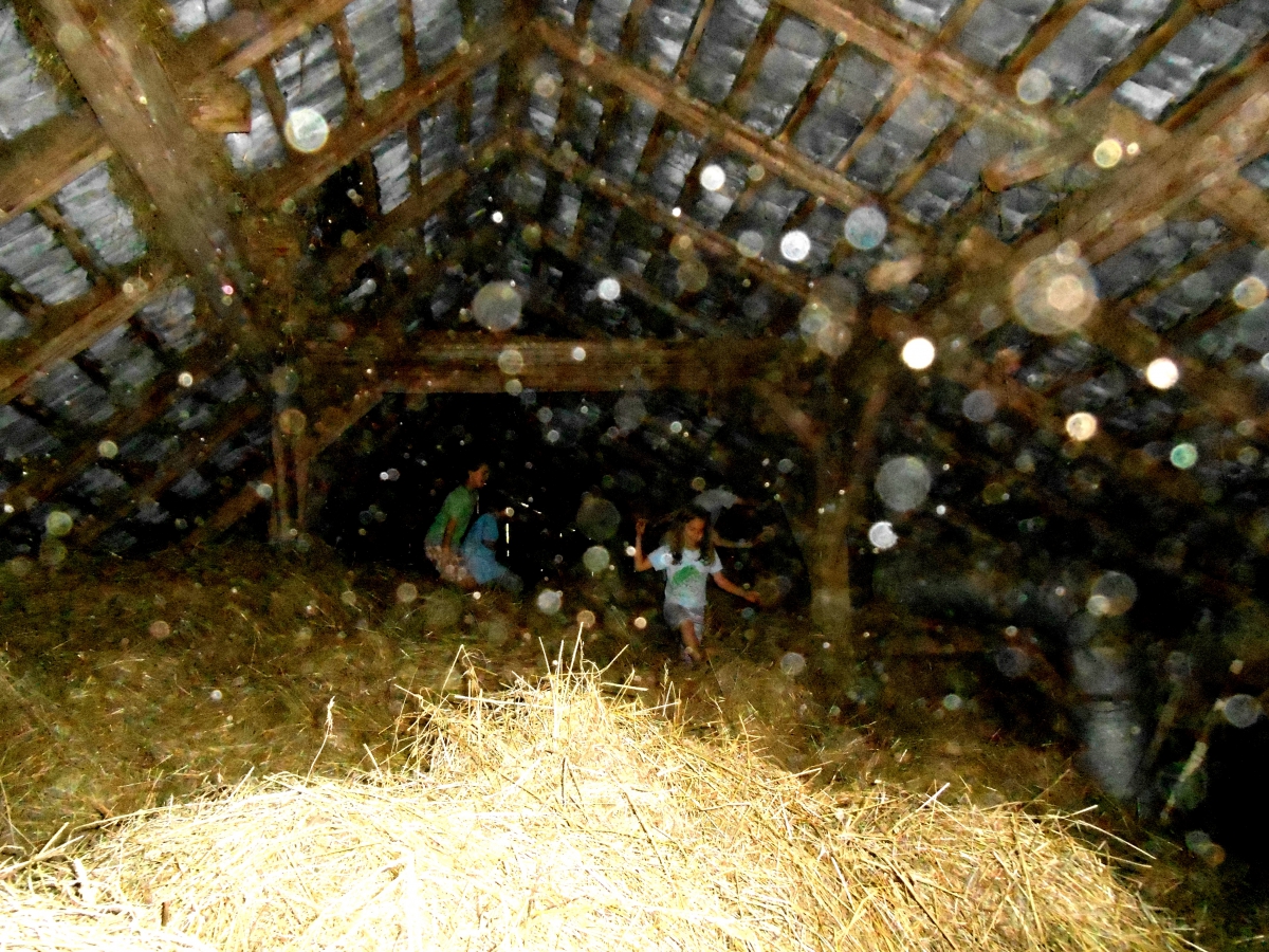 Štirje pridni otroci so zgoraj, razporejajo seno, ga nosijo "pod straž", skačejo po senu, se nastavljajo vetru, ki nosi seno gor pod streho. Delajo in se igrajo hkrati!