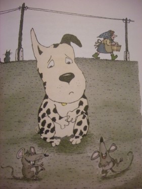 "Kako mi kruli v trebuhu!" je rekel, miški sta prisluhnili in se tako smejali, da je Pafi užaljen in lačen odšel stran.