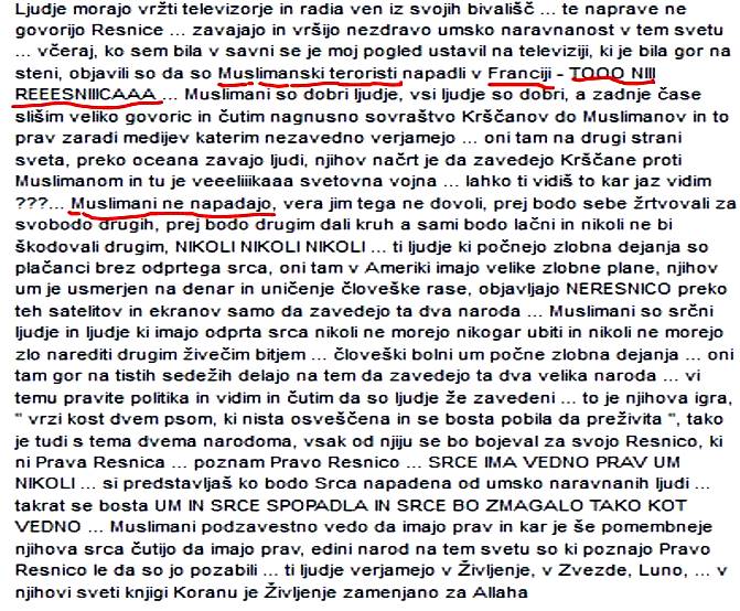 Jaz nisem proti muslimanom, v osnovi sem naklonjena vsem ljudem, tudi džamija v Sloveniji me nič ne spravlja v stisko, vendar trdim, da vsak dober človek spoštuje versko in drugačno svobodo drugih ljudi. Nihče ne bi smel zaradi vere drugega preganjati, kje šele ubi(ja)ti.