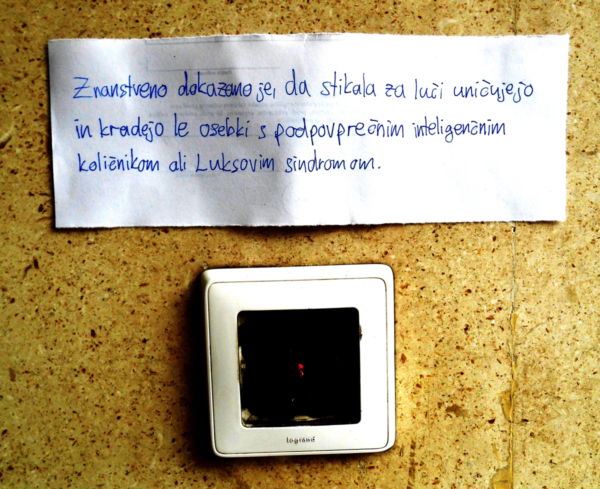 Kaže, da je ta hec zbodel pravega človeka, tistega, ki razbija stikala, saj je listek nenavadno hitro izginil - še dobro, da sem ga prej poslikala! (Datum fotografije: 9. 4. 2014.)