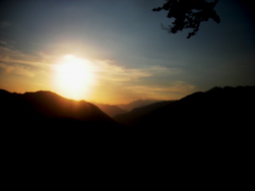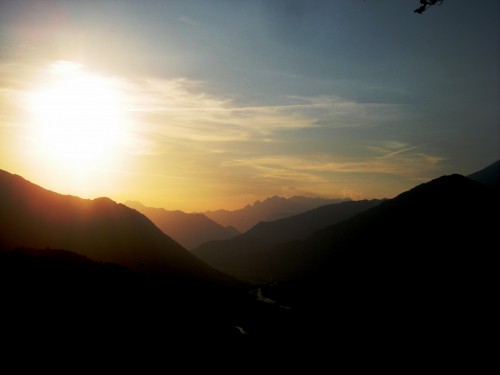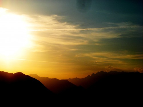Na Senici, hribom nekako nad Mostom na Soči (ampak ne danes ...). In tam daleč (na desni polovici slikce) je Krn! Tisti skrajno levi od najvišjih gora - aha, najvišje vidnih - glede na fotko! Kajti skrajno levo na fotki, pokrito z osončenimi oblaki, je Kaninsko pogorje ....