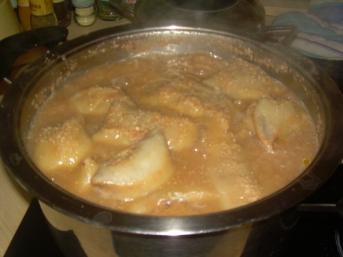 To potem skuhamo v vreli vodi, seveda ne vem, kako dolgo se kuha. Po občutku pač, ene 15 minut, recimo.