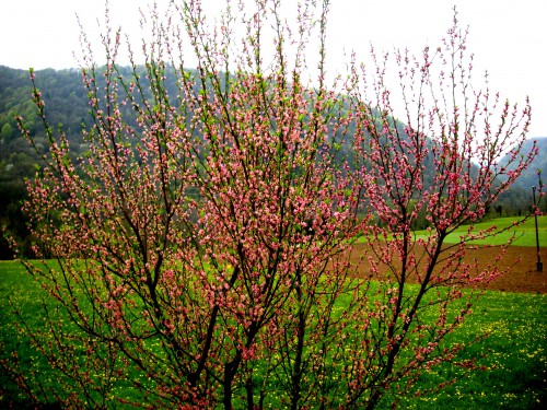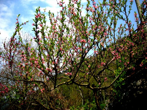Vrt se budi iz zimskega spanja, vse barviteje spet diha ... Tole je vinogradniška breskev, zrasla je iz koščice, ki smo jo sami posadili v