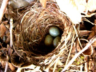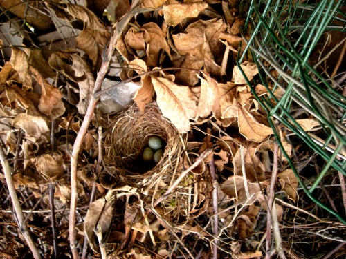 Še nekaj pomladanskega: Ko sem nesla veje in jih vrgla na kup, sem splašila ptico - in ugotovila, da ima gnezdo na vrhu kupa suhih vej! Upam, da ne bo kakšen podjeten maček plezal na kup ... (Tukaj je bilo gnezdo predlani. Enkrat prej pa tukaj.)