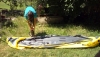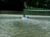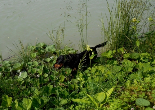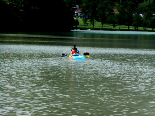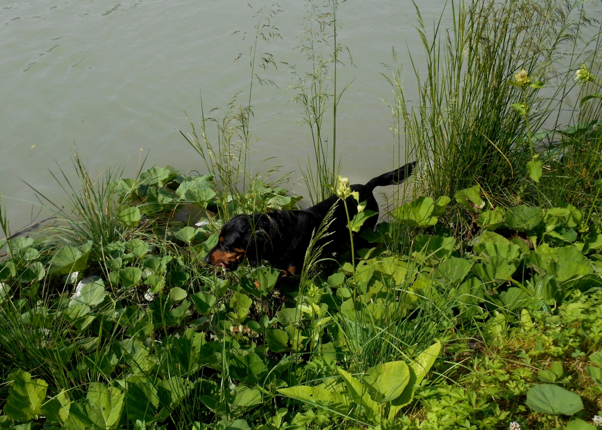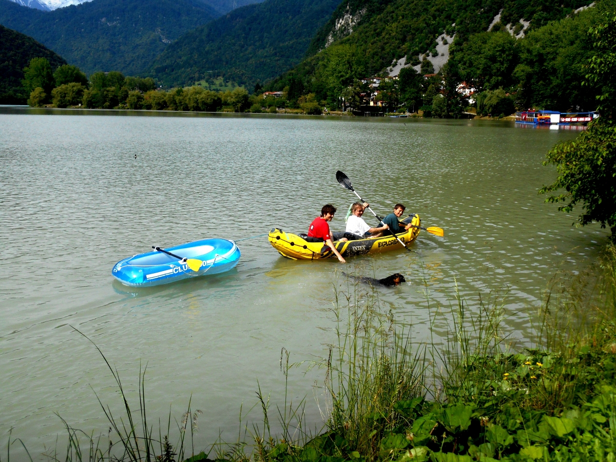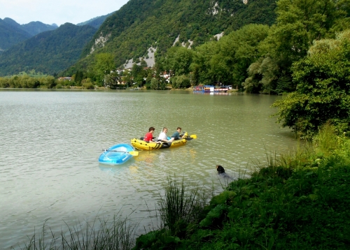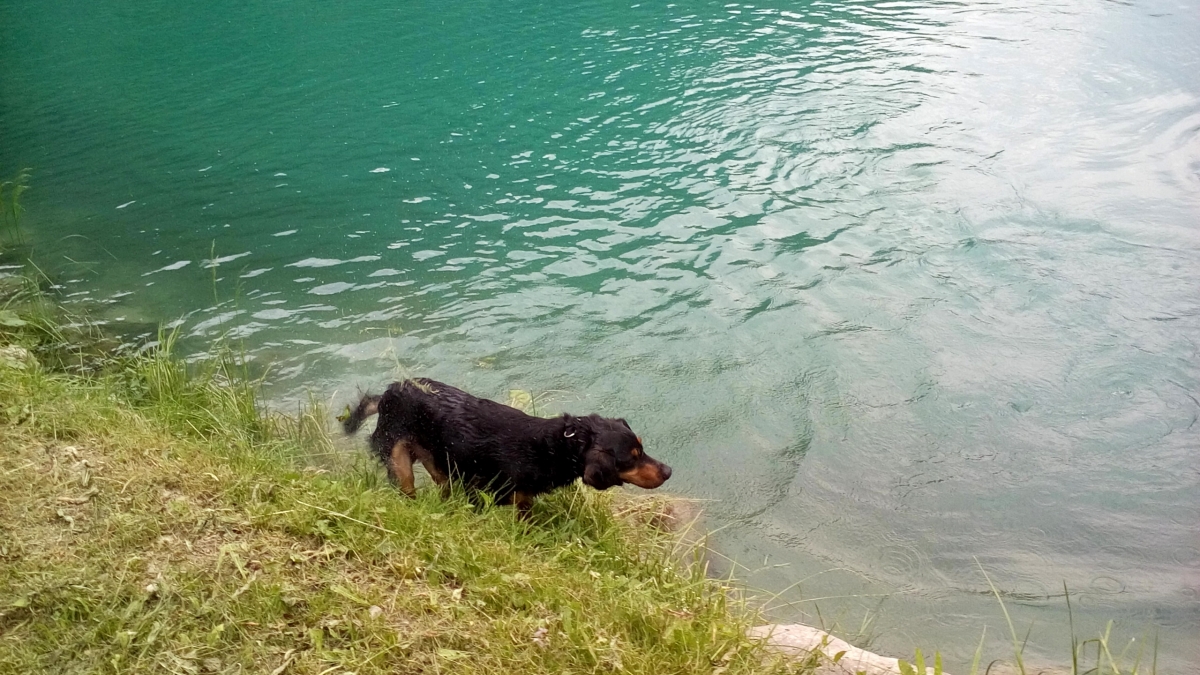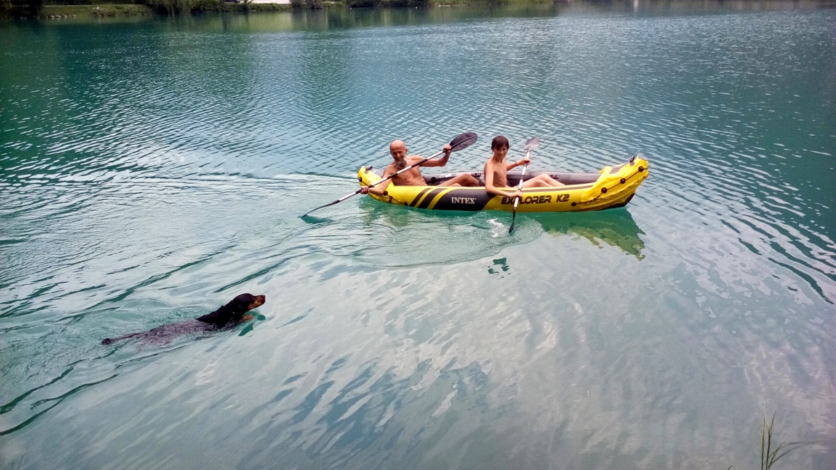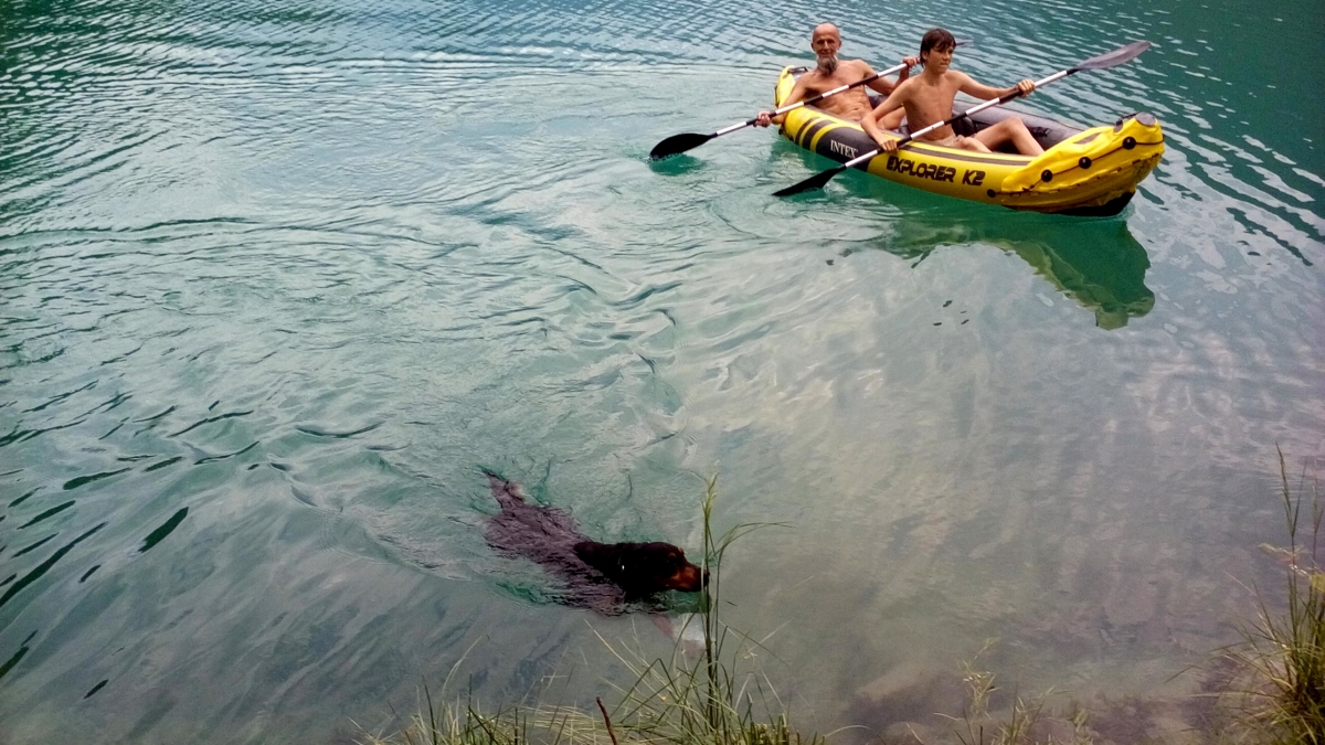No, ampak slednjič vendar najdem moje svetovne popotnike, prav uživajo na jezeru ... Pes zaplava k njim. Ker mu ne pustijo v čoln, da ga s kremplji ne bi preluknjal, revež vidno razočaran zaplava nazaj.