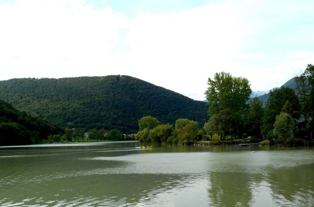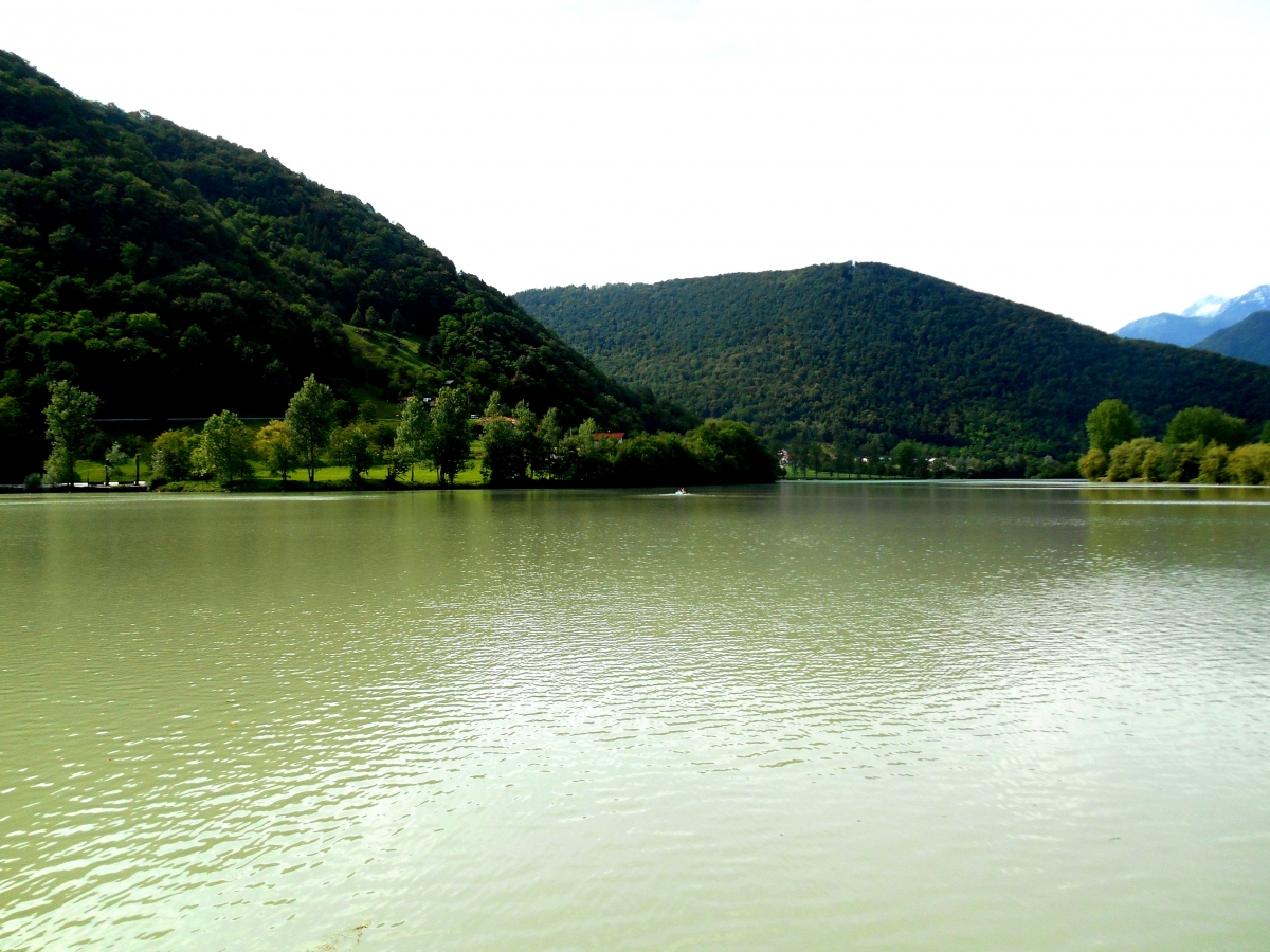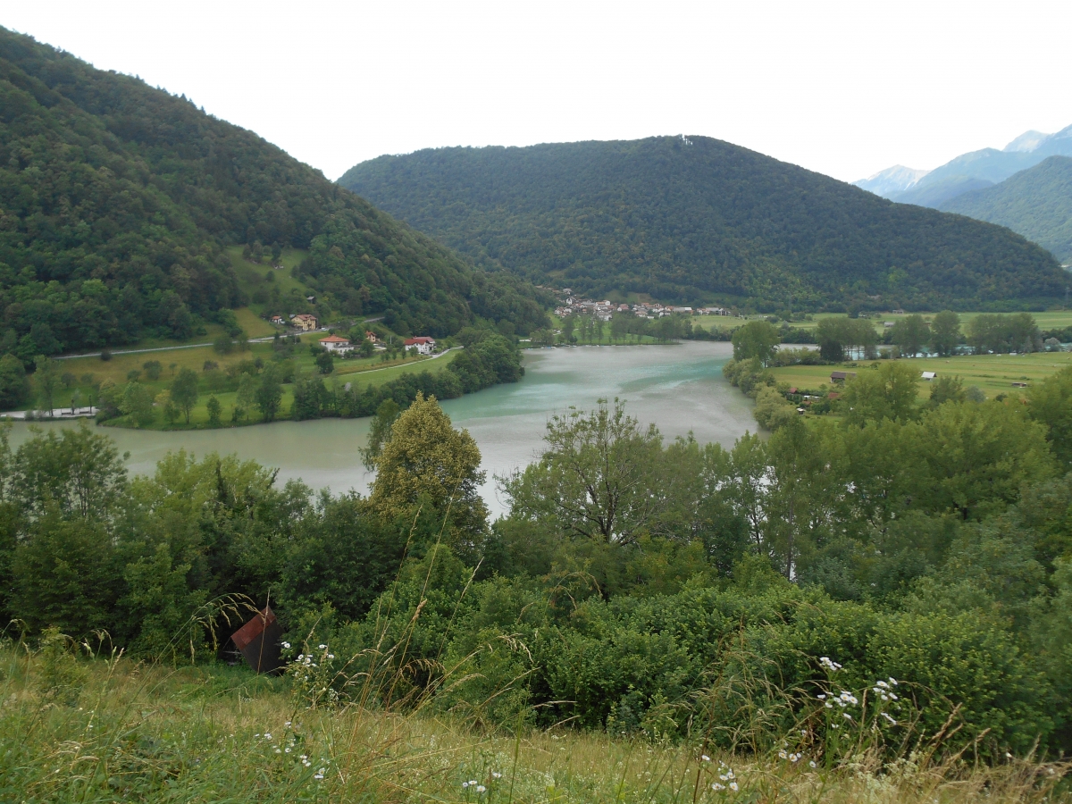 Tečeva naprej po poti in pritečeva na razgledno točko nad Mostom na Soči, ob pokopališče, ampak naj še tako gledam, na jezeru ni našega čolna. In joj, kako blatno je jezero. Gotovo je v Soški dolini zelo deževalo; Idrijca je tiste skrivnotno zelene barve kot ponavadi.