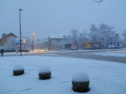No, potem čakava skupaj pred semaforjem. Ko me pogleda, ga vprašam, če ga zebe. Debelo me pogleda. Pa rečem, če gre v šolo ... Neodločno prikima. Meni je otrok simpatičen, pa skupaj sva tam čakajoča pa pomislim, na katero šolo neki hodi. Tam v bližini sta dve. Ampak, ker čaka z menoj, si mislim, da vem, v katero šolo gre.