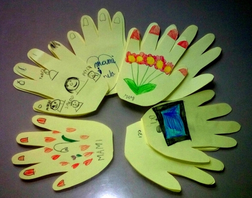 Iz papirja nastrižem rokice, cel kup rokic, za vsega otroka dve ... Eno za očija in eno za mamico. Vsak otrok postavi rokici predse in na eno napiše "mami" in na drugo "o