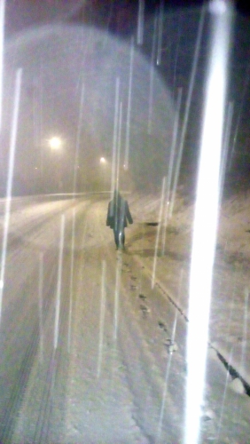 Ponoči se s kolesom vozim proti domu, dobre pol ure daleč. No, seveda je še marsikje sneg (tudi kolesarske steze so delno zasute ali pa jih naenkrat zmanjka) ali pa je poledenelo. Vozim res previdno, ponekod bolj kot bi imela skiro :) No, p